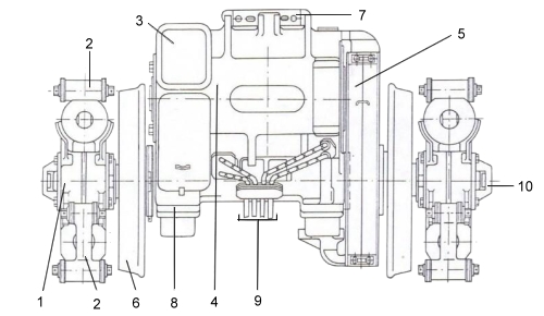1= Achslager, 2= Achslenker(Lemniskatenlenker), 3= Anschluß für Fahrmotorlüftung, 4= Fahrmotor, 5= Ritzelkasten, 6=Radscheibe mit Spurkranz, 7= Drehgestellabstützung (Drehmomentstütze), 8= Tatzlagergehäuse 9= elektr. FM - Anschlüsse, 10= Achslagerdeckel (Anschlussmöglichkeit für diverse Zusatzgeräte, z.B. Indusi, Gleitschutz)